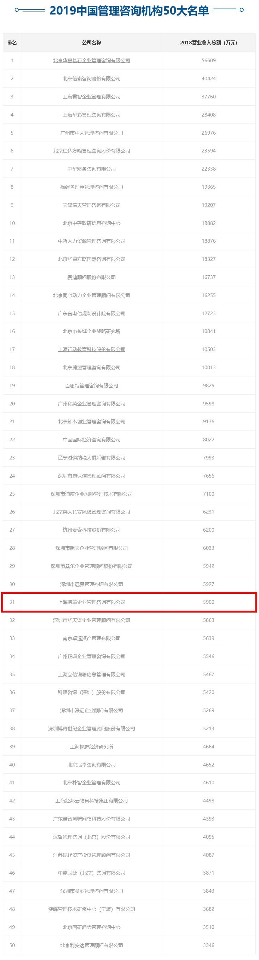 - 【喜訊】博革咨詢榮登“2019中國管理咨詢機(jī)構(gòu)50大名單”第31位!