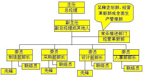 如圖所示,在持續(xù)改善管理委員會(huì)中,由總經(jīng)理?yè)?dān)任主任,副總經(jīng)理或其他愿意變革的人擔(dān)任副主任。常務(wù)推進(jìn)部門負(fù)責(zé)全面推進(jìn)或跨部門推進(jìn)課題,在國(guó)內(nèi)企業(yè)中又稱為企劃部或全面生產(chǎn)管理部等。每個(gè)部門都必須有先鋒和聯(lián)絡(luò)員,由先鋒做起,樹(shù)立模范榜樣,然后水平推廣,進(jìn)行跨部門的改善。