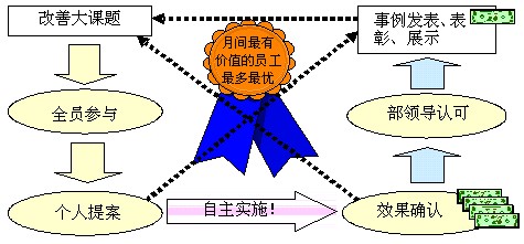 改善最開(kāi)始的時(shí)候可以不完全以經(jīng)濟(jì)目的為重,隨著改善的推進(jìn)逐漸把經(jīng)濟(jì)目標(biāo)作為一項(xiàng)改善要求,確認(rèn)其有形的財(cái)務(wù)效果,經(jīng)過(guò)部門領(lǐng)導(dǎo)的認(rèn)可后,將事例發(fā)表和展示出來(lái),并對(duì)當(dāng)月最有價(jià)值的員工進(jìn)行表彰,過(guò)程如圖所示。