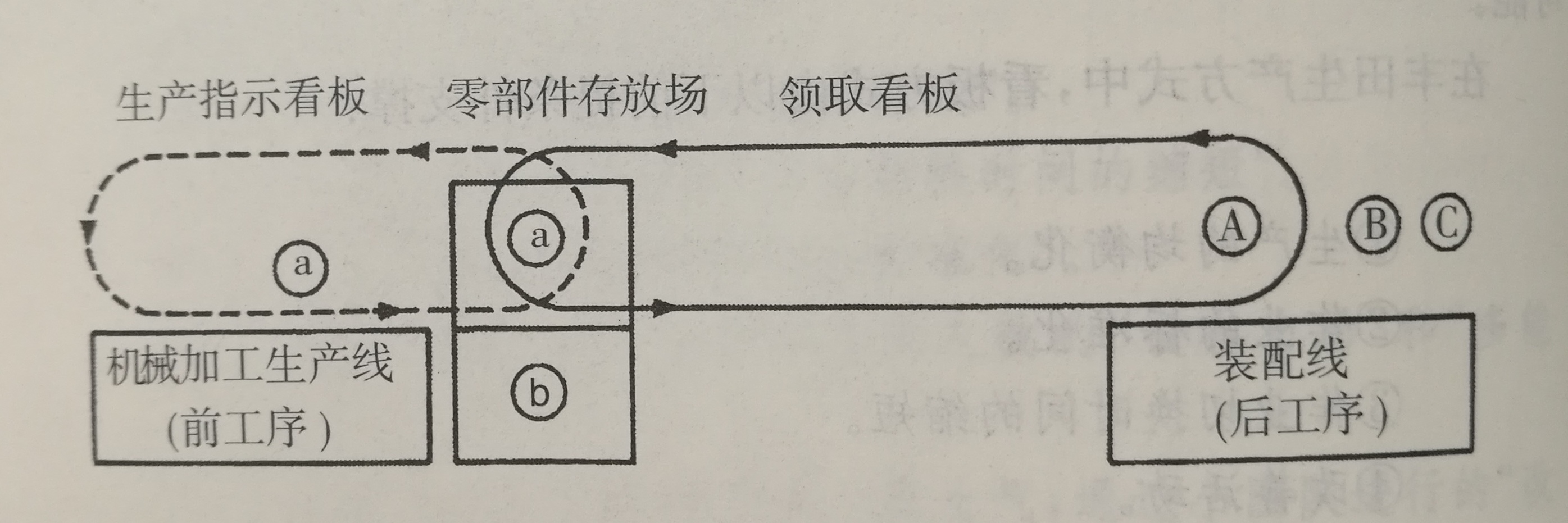 制造產(chǎn)品A的裝配線的搬運(yùn)工為了領(lǐng)取必需的零件a,帶著空零件箱和領(lǐng)取看板來到機(jī)械加工生產(chǎn)線。然后,在零部件存放場a取出與領(lǐng)取看板相同數(shù)量的零件箱,并摘下掛在這些零件箱上的生產(chǎn)指示看板。接著把這些零件箱與領(lǐng)取看板一起帶回自己的裝配線,