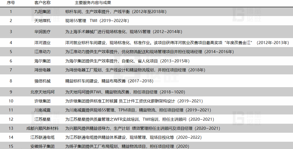 實戰(zhàn)經(jīng)驗:結(jié)合豐田(TPS)、丹納赫(DPS)、美的(MBS)等企業(yè)精益系統(tǒng)建設經(jīng)驗,為企業(yè)量身訂制精益管理管理系統(tǒng),從制造性企業(yè)管理的基礎,現(xiàn)場/效率/質(zhì)量/設備管理/班組等維度系統(tǒng)提升企業(yè)管理水平,同時培養(yǎng)精益管理人才;為企業(yè)成功輔導的現(xiàn)場管理、效率管理、流程管理、工廠物流配送項目、工廠生產(chǎn)規(guī)劃等超過1000個,使全價值鏈總成本降低30%、制造周期縮短50%、生產(chǎn)效率提升35%、庫存降低35%、準時交付率提升50%,帶來的直接財務收益數(shù)千萬元。