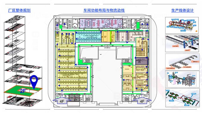 規(guī)劃和設計有效地利用設備、空間、能源和人力資源;簡化生產(chǎn)加工過程并降低管理難度;提高工廠可視化效果,提升工廠整體形象的同時,能夠按客戶需求節(jié)拍,強制平衡流動的生產(chǎn)工藝布局。