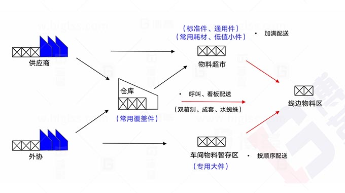 上海博革咨詢將協(xié)助您從簡單的推動式物流結構轉(zhuǎn)變?yōu)槊艚菔轿锪吓渌拖到y(tǒng)。我們將根據(jù)不同的物料采購渠道,規(guī)劃設計3種車間物料存儲區(qū)域(物料暫存區(qū)、物料超市區(qū)、線邊物料區(qū)),并對這3種模式尋找和設計合適的配送方式(雙箱制、水蜘蛛模式、成套配送、直接上線)和包裝器具。