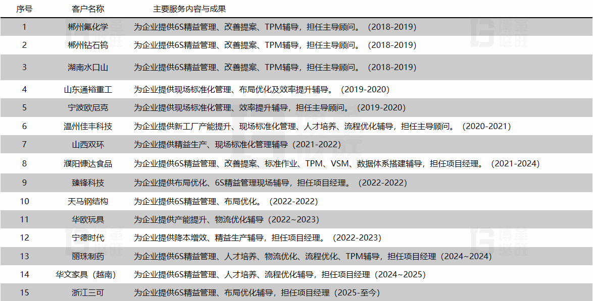 實戰(zhàn)經(jīng)驗:擁有14年的精益管理項目推行與培訓(xùn)經(jīng)驗,專注于通過精益管理幫助企業(yè)達成降本增效目標(biāo)。在日本進行過精益管理深造,并在跨國公司擔(dān)任精益管理推動負責(zé)人。對企業(yè)降本增效,企業(yè)精益人才培養(yǎng),企業(yè)流程優(yōu)化,品質(zhì)改善提升,布局優(yōu)化,6S精益管理等,具備豐富的實戰(zhàn)經(jīng)驗。擅長幫助企業(yè)建立完善的精益體系,運用QCC、VSM等精益管理方法,幫助企業(yè)達成PQCD改善目標(biāo)。專注務(wù)實,是落地式精益管理的踐行者。曾主導(dǎo)多家大型企業(yè)精益管理項目,幫助客戶達成了集團年度精益管理目標(biāo)。