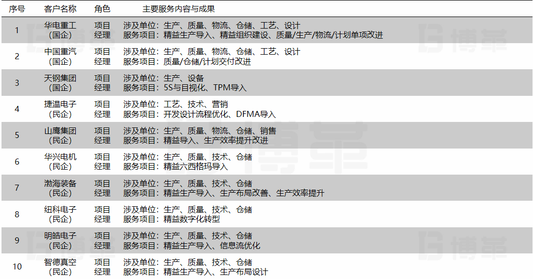 主講課程:精益生產(chǎn)方法工具課程(包含TPM,快速換型,價值流分析,5S與目視化等);六西格瑪DMAIC、DMEDI 綠帶課程,質(zhì)量工具(APQP,F(xiàn)MEA,控制計劃,SPC等),質(zhì)量提升三部曲、PMC