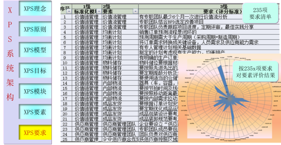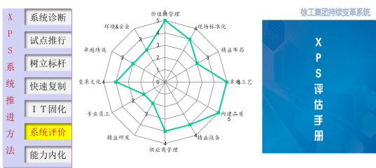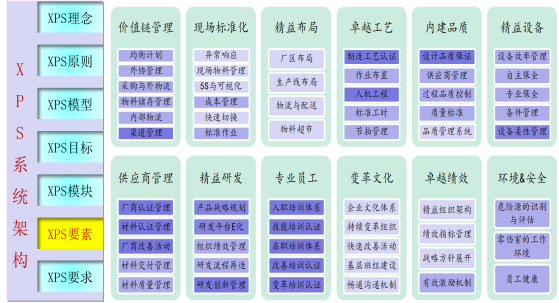 XPS持續(xù)變革系統(tǒng)分別從理念,原則,模型、目標(biāo)、模塊、要素。要求等七個方面進(jìn)行規(guī)劃和建模。既有深度,又有廣度,同時,建立評價要素和實(shí)施要求,也達(dá)到了集團(tuán)戰(zhàn)略要求迅速推進(jìn)精益變革的戰(zhàn)略要求。