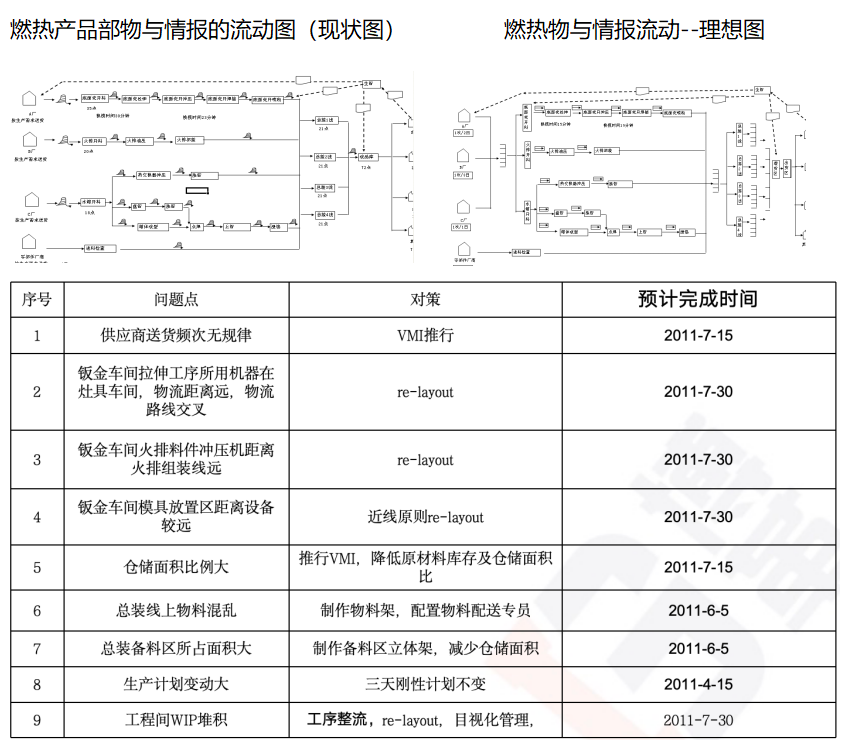 通過對配件車間內(nèi)油壓機(jī),火排沖壓設(shè)備,火排裝配線,水箱沖壓設(shè)備,小U開料設(shè)備,總裝車間備料區(qū)等設(shè)施進(jìn)行重新規(guī)劃、調(diào)整,減少車間一次物流距離1500M,在制品面積下降63%,庫存金額下降50%。通過燃熱產(chǎn)品部物與情報現(xiàn)狀圖與理想圖對比,得出目前存在的問題并設(shè)置改善對策。