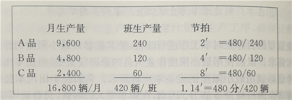 在這里,節(jié)拍時間是用一個班也就是480分鐘的生產(chǎn)量去除一個班的時間480分鐘得出的。根據(jù)這個計算結(jié)果,A品2分鐘生產(chǎn)一輛,B品4分鐘生產(chǎn)一輛,平均下來用1.14分鐘生產(chǎn)一輛即可。