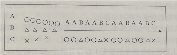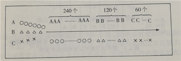 于是,如果用節(jié)拍時(shí)間制造所有的品種,每種產(chǎn)品都要用全部車種的平均節(jié)拍時(shí)間來制造,而每種產(chǎn)品的節(jié)拍時(shí)間在編排各種產(chǎn)品的順序時(shí)考慮就可以了。在豐田汽車公司為了均衡生產(chǎn)面編排的順序,就像圖1那樣。