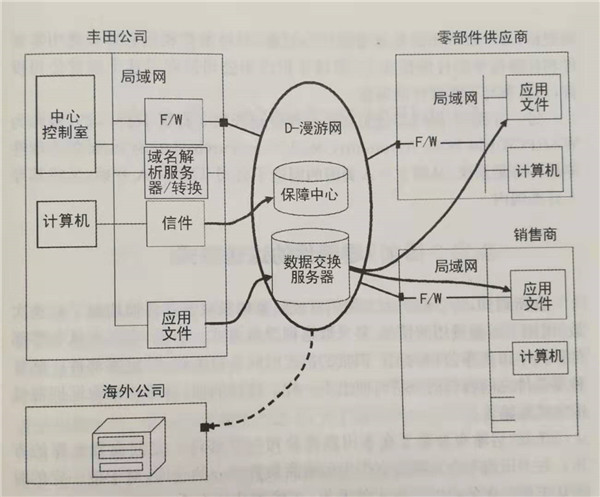在豐田汽車(chē)公司,TDC開(kāi)發(fā)了被稱(chēng)為“D一漫游網(wǎng)”的豐田集團(tuán)內(nèi)部網(wǎng)絡(luò),并通過(guò)它建立了豐田BtoB( Business to Business)系統(tǒng)的新TNS,所謂豐田集團(tuán)內(nèi)部網(wǎng)絡(luò),雖然字面上稱(chēng)為“內(nèi)部網(wǎng)格”,但實(shí)際上就是一般所說(shuō)的企業(yè)間的“外部網(wǎng)絡(luò)”。新TNS的基本結(jié)構(gòu)如圖1所示,與原來(lái)相比,傳輸速度加快了,一個(gè)文件夾的容量也變大了,文件信息和圖像信息也可以傳輸了。