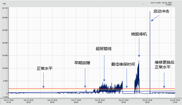 如下圖所示,某機(jī)床通過振動分析,可以看到10月18日振動加速度峰值觸發(fā)早期預(yù)警閾值,但是由于生產(chǎn)計(jì)劃問題,沒有停機(jī)維護(hù);10月22日機(jī)床主控系統(tǒng)觸發(fā)故障,不得不停機(jī)過10個(gè)小時(shí)維修和更換軸承,維修后,振動恢復(fù)正常水平,但較大損失已經(jīng)造成。