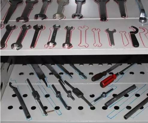 方法3:做成看板展示式或多層推拉式的展示板,下圖為看板展示式的展示板,所有的工具、零件都有固定的位置和標(biāo)識(shí),采用形跡管理的方式進(jìn)行管理,查找起來(lái)非常方便。