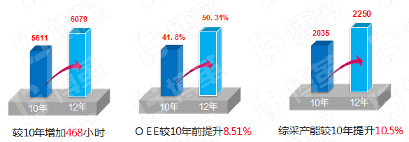 通過(guò)以提高設(shè)備綜合效率OEE為主要手段的一系列措施實(shí)施,綜采較2010年增加實(shí)際作業(yè)生產(chǎn)時(shí)間468小時(shí),可多產(chǎn)煤80多萬(wàn)噸。目前綜采OEE較2010年提升8.51%;產(chǎn)能較2010年提升10.5%;